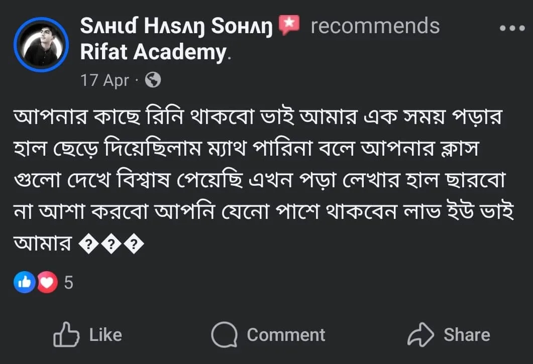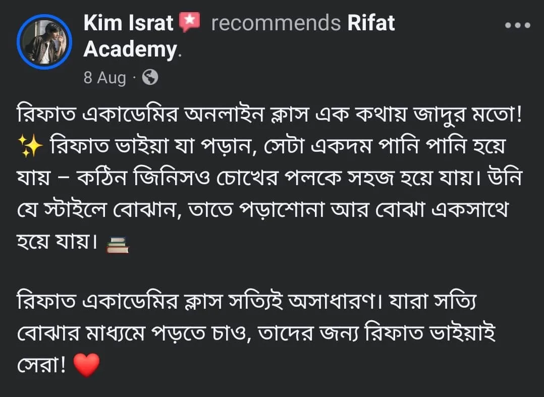 রিফাত একাডেমির মাধ্যমে তাদের শেখার যাত্রা বদলে গেছে—এমনই অভিজ্ঞতা শেয়ার করেছেন আমাদের শিক্ষার্থীরা।